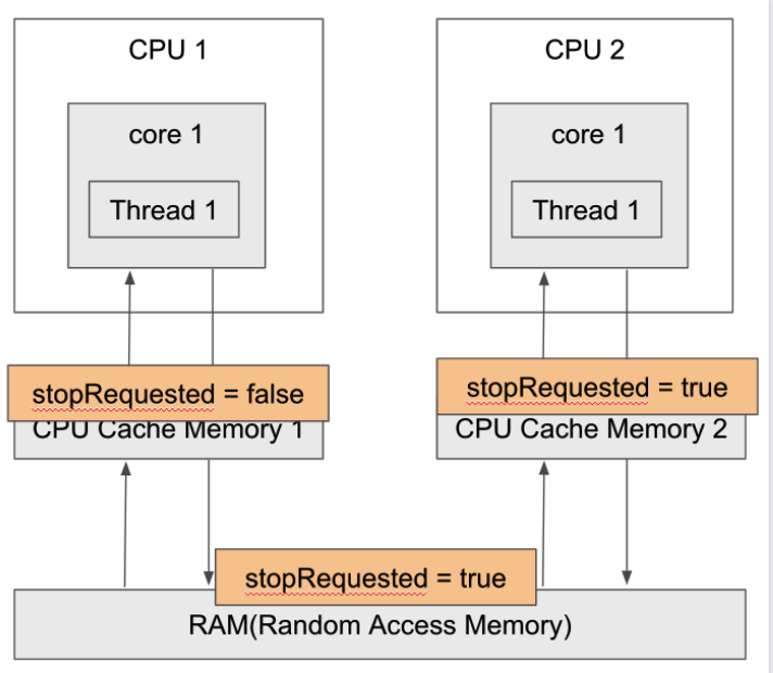 CPU1 이 backgroundThread 를 사용하고, CPU2 가 메인쓰레드를 사용한다고 해보자. CPU1에서는 stopRequested의 값을 false 로 가지고 있을 것이다. CPU2 에서는 해당 값을 true 로 업데이트하고, RAM에 업데이트 했다. 하지만 처음에 말했듯, RAM에서 매번 데이터를 가져가는 것이 아니라 적정시점에 데이터를 가져가게 된다.