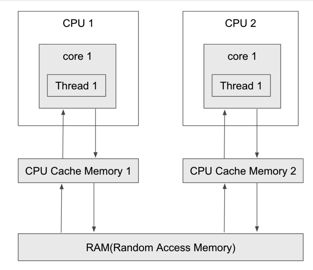 CPU가 어떤 작업을 하기 위해서 데이터를 필요할 때, RAM의 데이터를 Cache Memory에 읽고 사용한다. 쓰기를 할 때도 마찬가지인데, 매번 RAM에 데이터를 쓰거나 읽는 것이 아닌, Cache Memory에서 읽고 쓰기를 하고, 적정 시점에 RAM 에 업데이트를 한다. 이 과정에서 동시성의 문제가 발생한다.